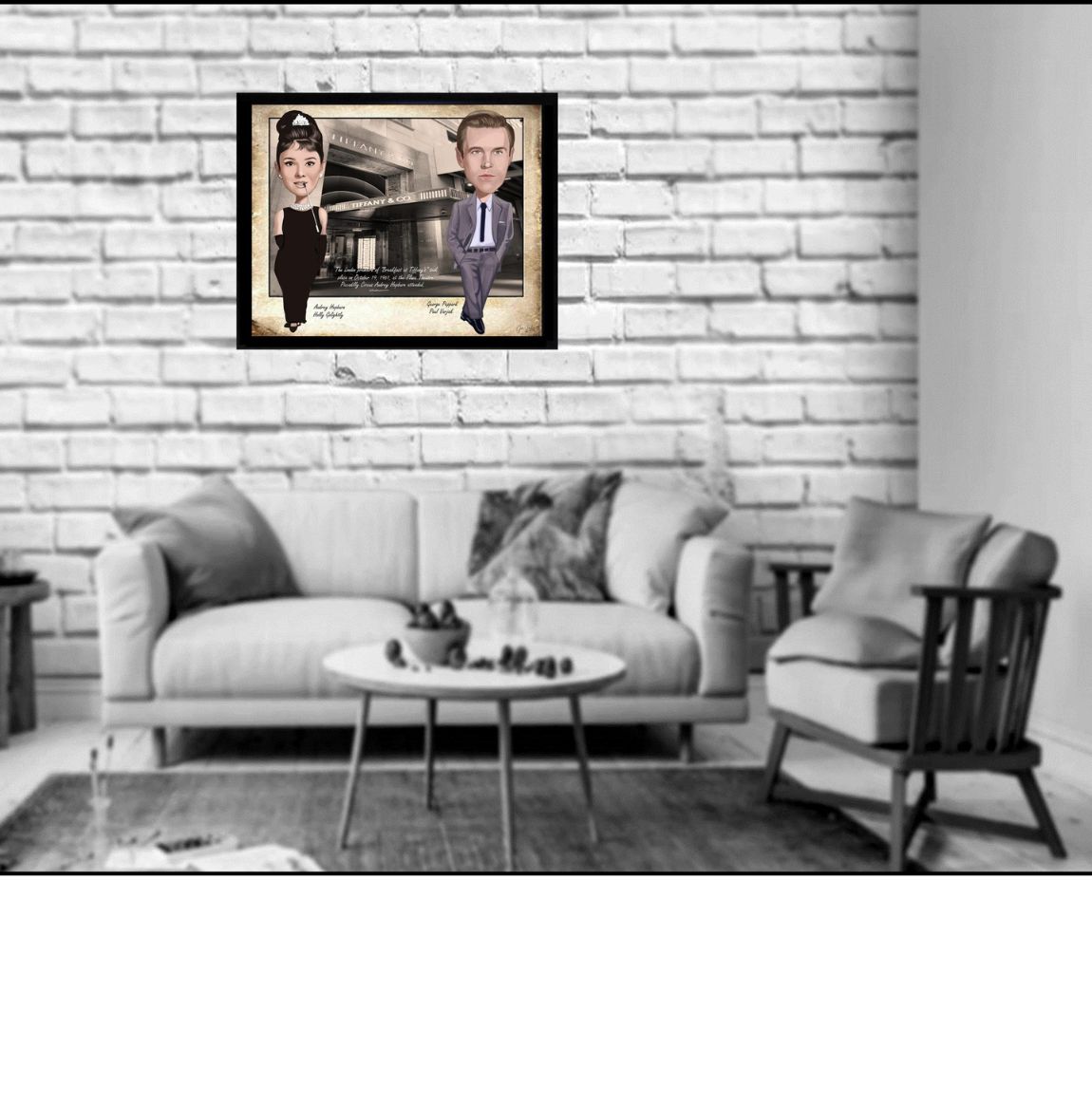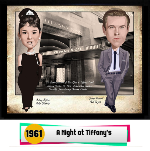 Step into cinematic history with this whimsical and stylishcaricature artwork celebrating the 1961 London premiere ofBreakfast at Tiffany’s. Featuring Audrey Hepburn as theiconic Holly Golightly and George Peppard as Paul Varjak, thispiece places the legendary duo outside the timeless Tiffany & Co. storefront, evoking the glamour and sophistication ofthe Swinging Sixties.Meticulously illustrated with vintage flair and set against areal photographic backdrop of Tiffany's, this collectible printis a tribute to fashion, film, and elegance. A must-have forclassic movie lovers and retro culture enthusiasts.