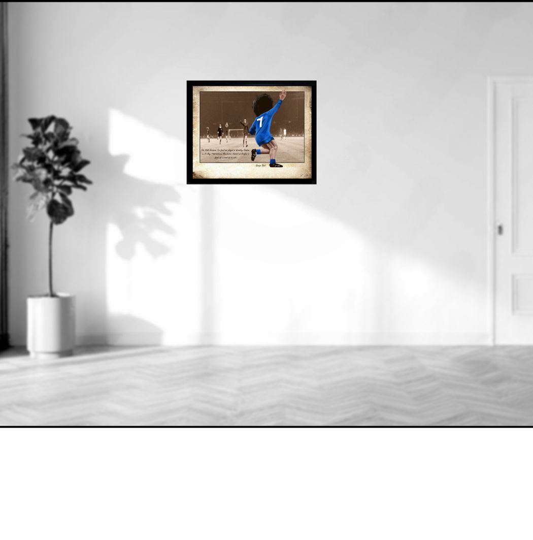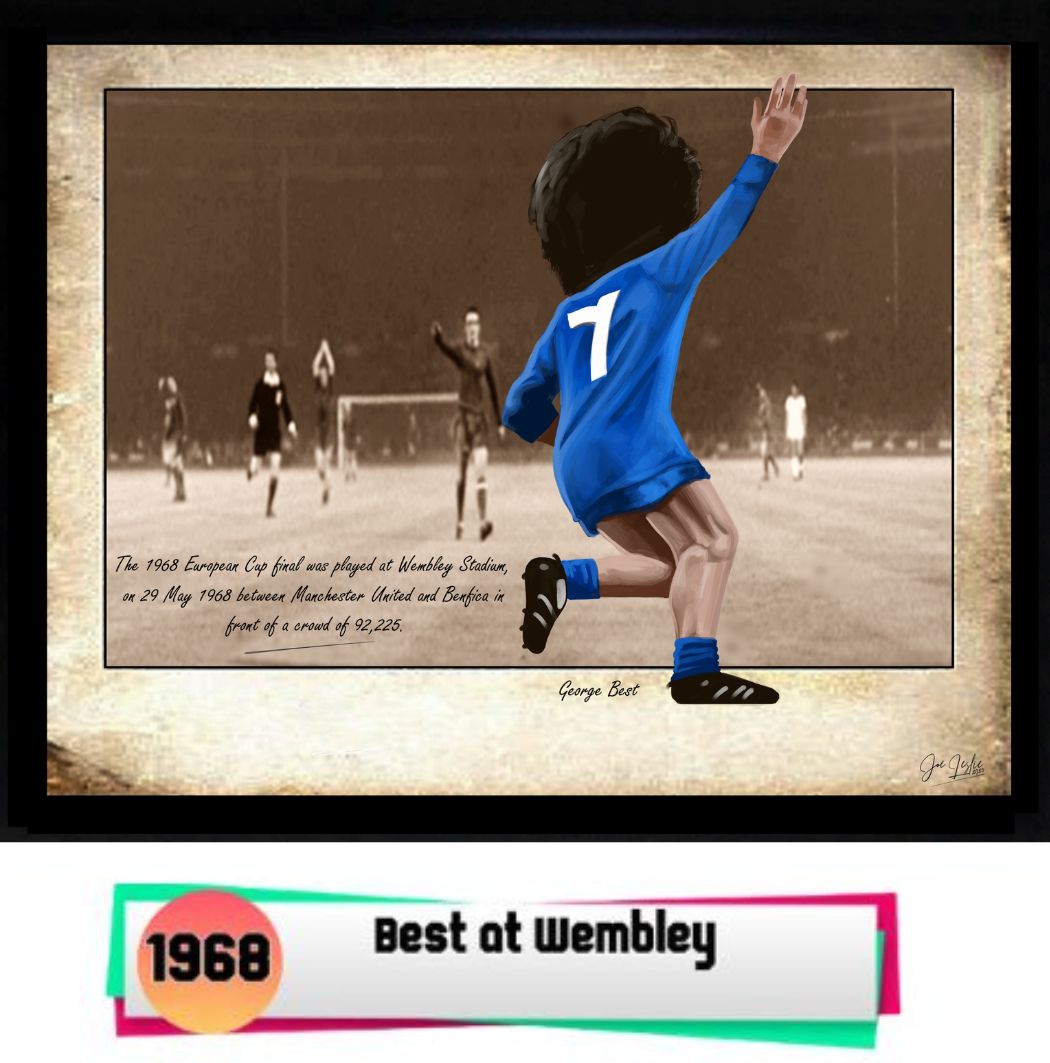 Reimagining George Best’s iconic goal during the 1968 European Cup Final at Wembley Stadium in this evocative tribute to one of football’s greatest moments . This artwork merges the grainy majesty of original black-and-white photography with a vibrant digital caricature of Best, captured mid-celebration in his unmistakable No. 7 shirt.