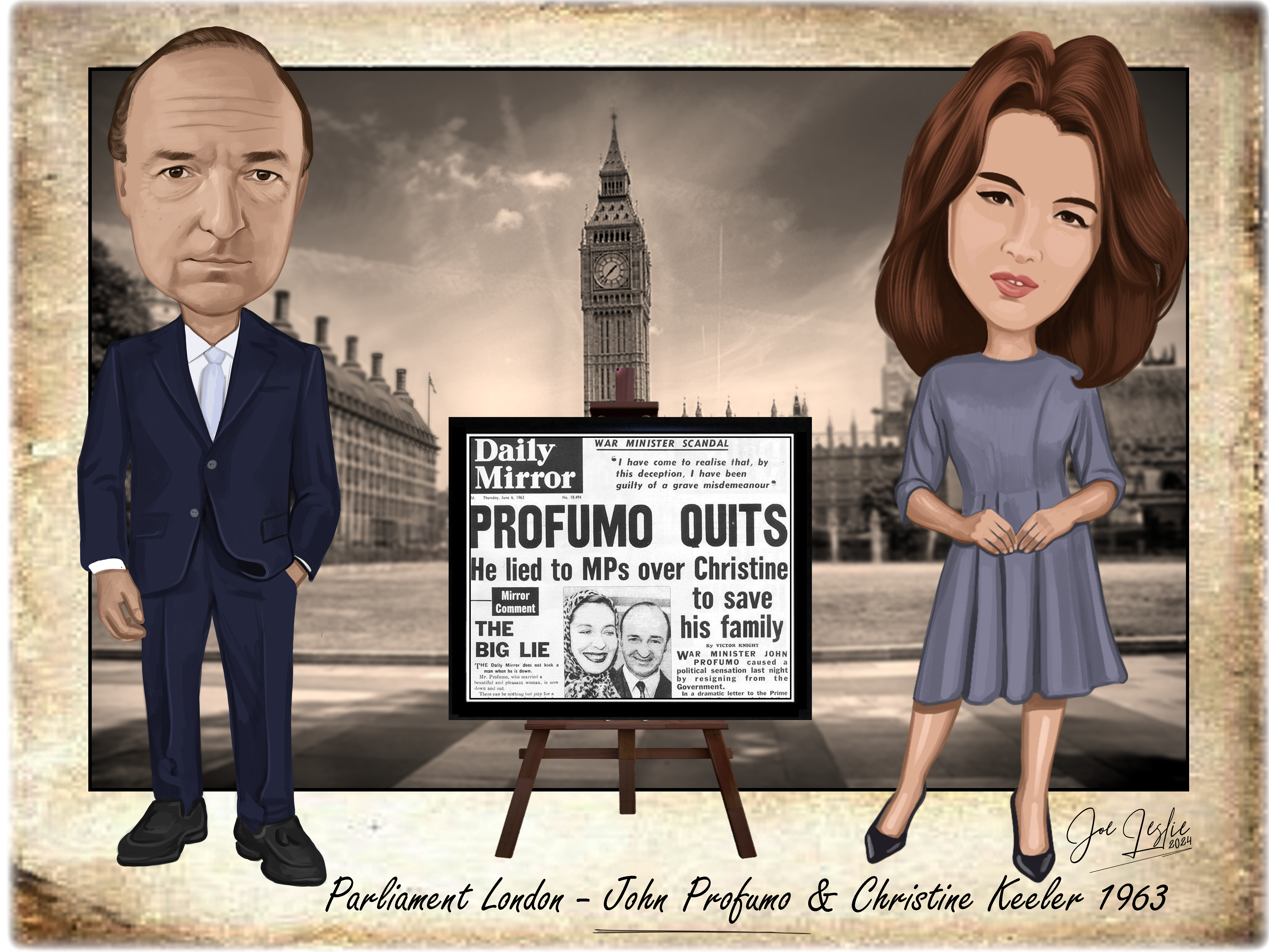 Absolutely love how this piece captures the infamous Profumo Affair in such a quirky yet tasteful way. The caricatures of John Profumo and Christine Keeler are spot on, and the backdrop of Parliament really sets the scene. A perfect addition to my retro collection!